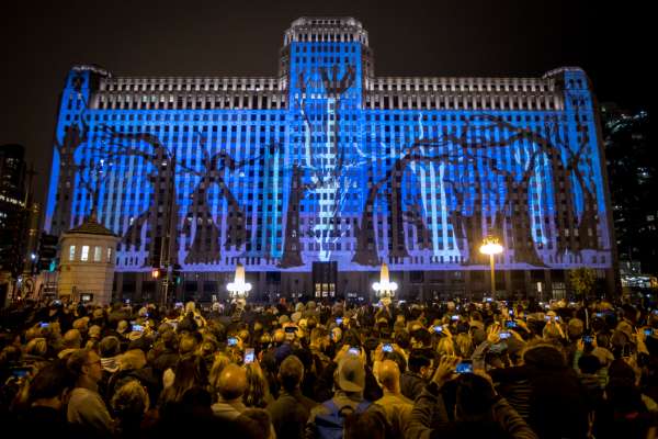 Wenn es dunkel wird, gehen Sie den Chicago Riverwalk und sehen Sie Kunst am MARTzu sehen, eine 25-stöckige Videoinstallation, die sich über die Seite des Merchandise Mart erstreckt. In der Weihnachtszeit können Sie sich auf Projektionen des Joffrey Balletts freuen, die vom Nussknacker inspiriert sind.